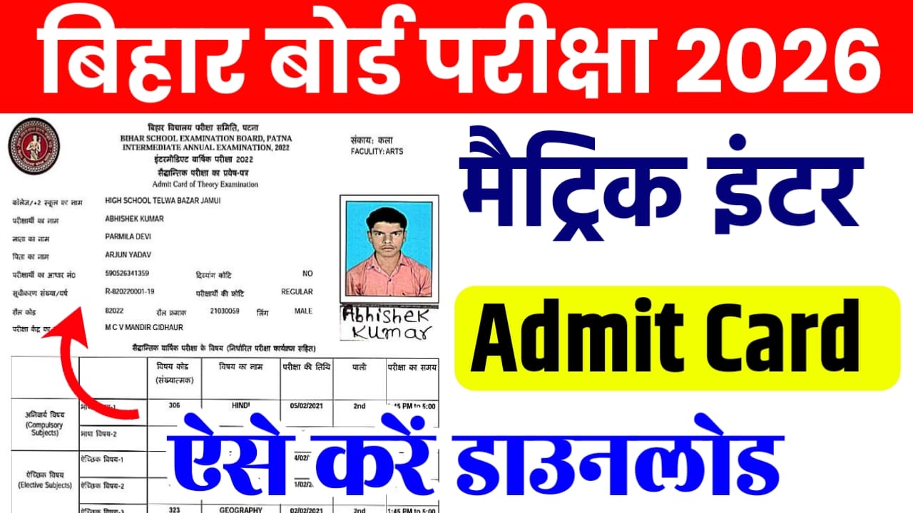 बिहार बोर्ड 10वीं व 12वीं (मैट्रिक व इंटर) वार्षिक परीक्षा 2026 के ओरिजिनल एडमिट कार्ड इंटर के लिए दिसंबर 2025 के अंत से जारी हो चुके हैं और मैट्रिक के लिए 8 जनवरी 2026 से स्कूल लॉगिन के माध्यम से डाउनलोड की सुविधा शुरू हो गई है। छात्र अपने-अपने स्कूल/कॉलेज से प्रिंसिपल की मुहर व हस्ताक्षर वाला प्रिंटेड एडमिट कार्ड लेकर ही परीक्षा में शामिल होंगे, क्योंकि स्टूडेंट डायरेक्ट लॉगिन से फाइनल एडमिट कार्ड डाउनलोड नहीं कर सकते।